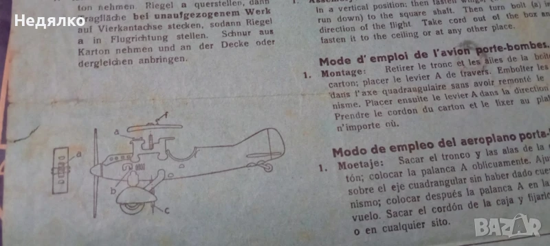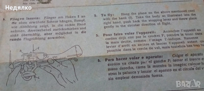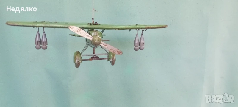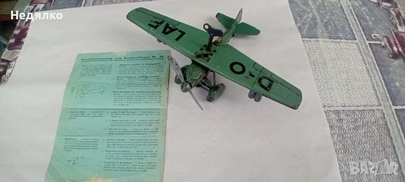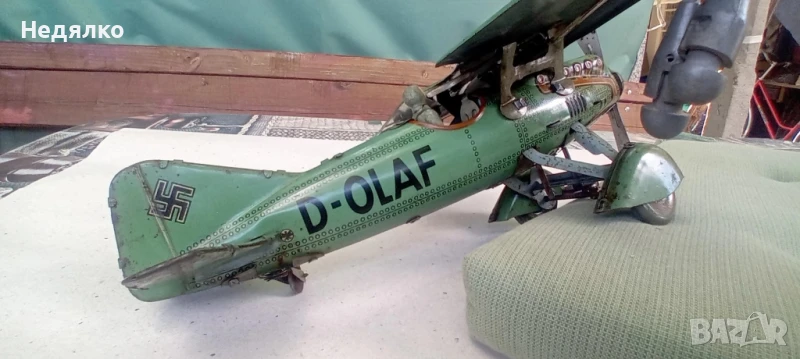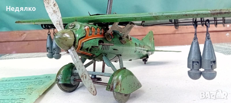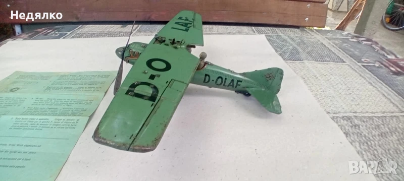 Уникат, с оригиналният си документ,инструкция за работа.Работещ,ръчна изработка, нулева серия,има история.Всичко си е оригинал с изключение на левия хоризонтален стабилизатор,липсваше и затова му направих нов и фиксирах отдолу и двата с малко прозрачно лепило Poxipol.Повече на телефона, само за сериозни, и нека не си губим времето в излишни коментари!