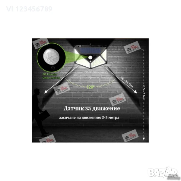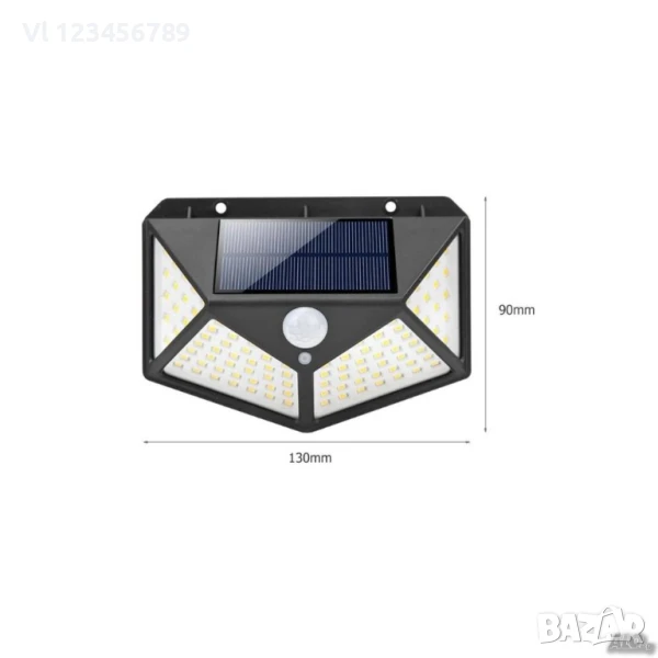 LED лампа със соларен панел и супер ярки 100 LED, диода с топло бяла светлина, осигуряващиотлично осветление до 1200 лумена. Външната лампа е с вграден PIR датчик за движение, проектиран с 120 ° -180 ° сензор с широкоъгълен светлинен лъч до 3 метра, достатъчно да покрие голямо параметър от вашият двор или градина.