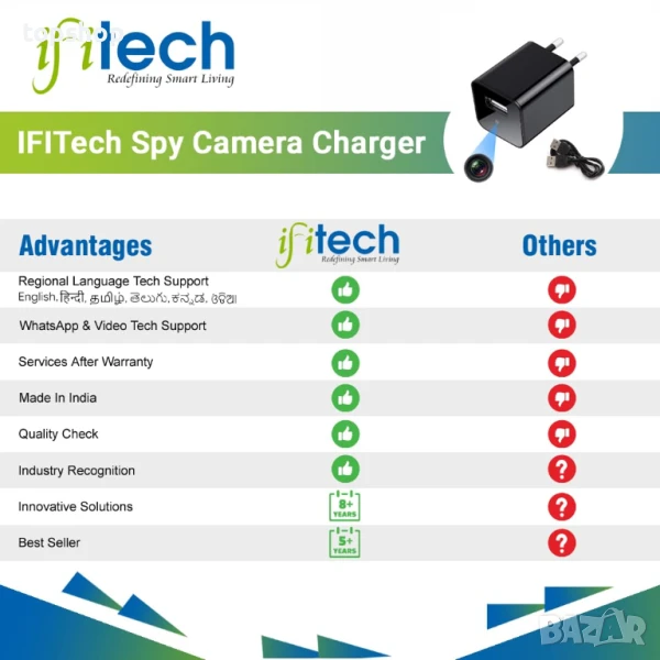 100% частен запис – Без прехвърляне на данни към облачни сървъри. Само вие имате достъп до записаното съдържание на вашата SD карта. Функция за мобилно зареждане – USB зарядно за камера IFITech. Работи и като истинско USB зарядно за смартфони и други устройства – допълнително удобство!