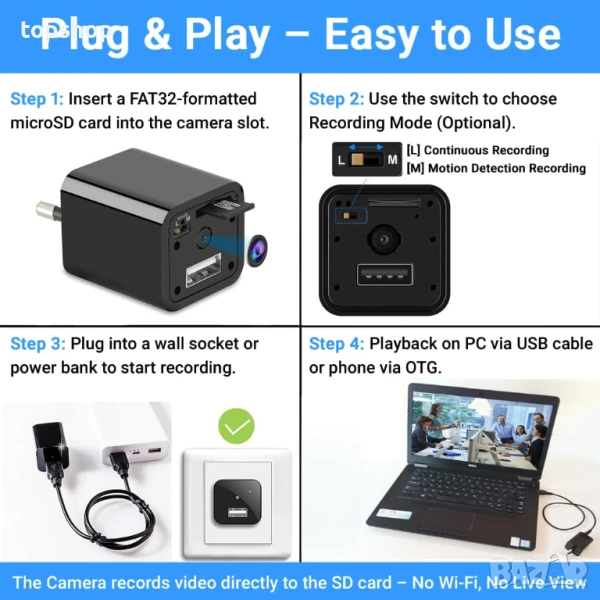 Plug & Play операция – Просто поставете microSD карта и включете камерата в контакт или power bank, за да започнете записа незабавно. Забележка: Поддържа microSD карти с формат FAT32 – Минимум 16GB, максимум 128GB. (SD картата не е включена)