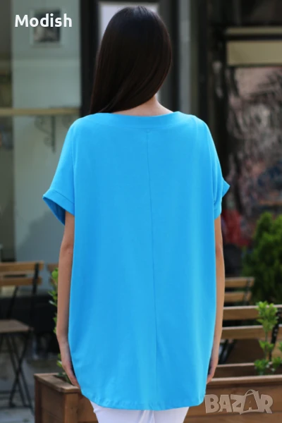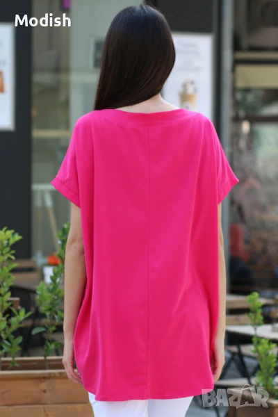Едноцветна дамска блуза от естествен, мек и качествен памук, с леко издължена задна част и къси прилеп ръкави. Моделът е с леко лодка деколте и се предлага в зелен, син и циклама цвят. Размерът е универсален и обхваща XL, 2XL, 3XL.