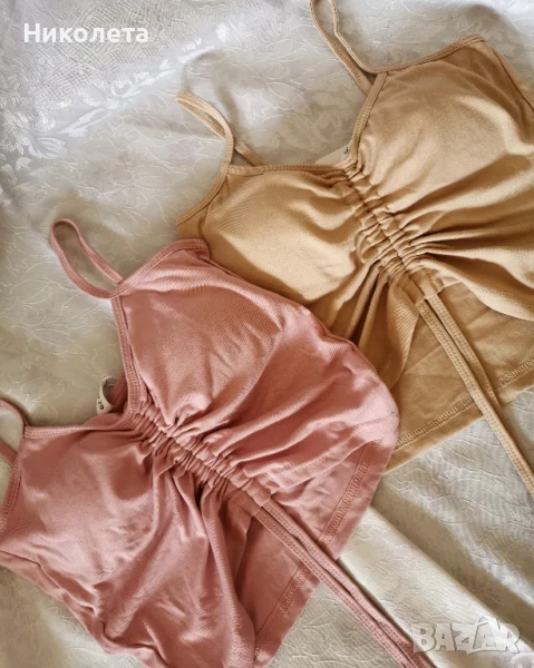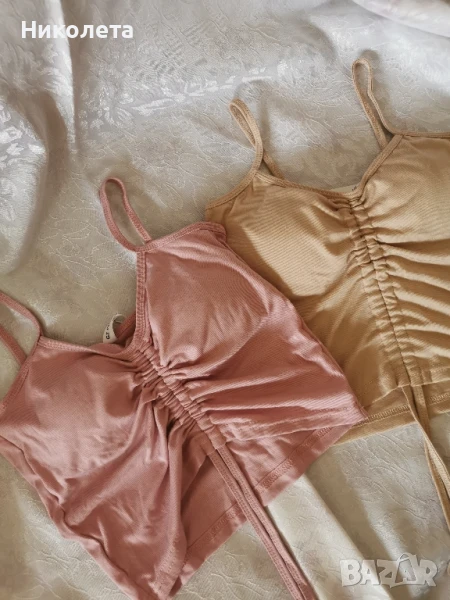 Продавам сет от 2 броя топове в розов и бежов цвят с връзки. Подходящи за лятото.