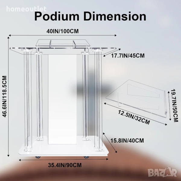 Размерите на сглобената катедра / църковен амвон са 118,5 см x 40 см x 90 / 100 см, което осигурява перфектна комбинация от лек дизайн и забележителна стабилност. Акрилният материал с дебелина 10 мм е силно устойчив на пожълтяване, напукване, деформация, повреди от вода и драскотини, което гарантира дълъг експлоатационен живот.
