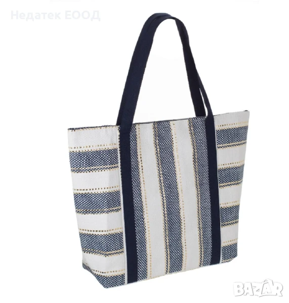 Лятна плажна чанта, синьо-бели райета със златно фолио, закопчаване с цип, сини платнени дръжки 32 см и вътрешен джоб. В нея удобно се побират кърпа, постелка, парео и бански костюм, както и всичко останало, от което се нуждаете на плажа.
