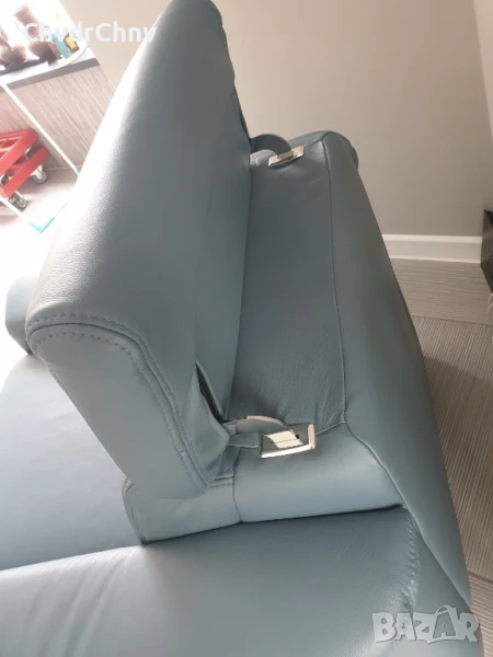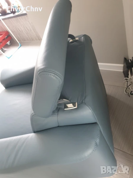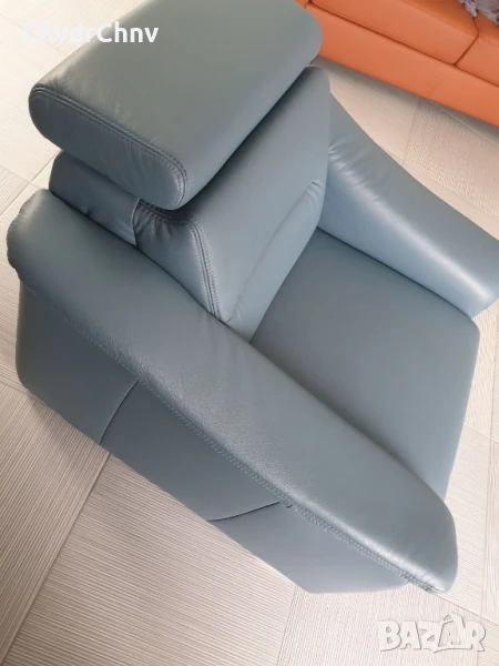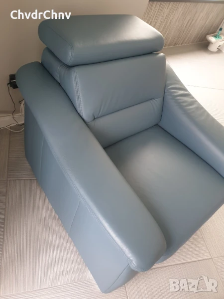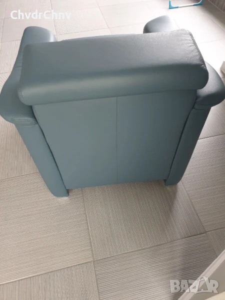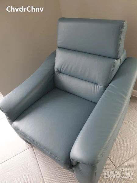 Фотьойлът е като нов (ритейл внос от Германия), от естествена кожа, без протрито/скъсано (не е ползван), здрави шевове, много удобен, мек, с модерен дизайн (подходящ за офис/приемна/кабинет), цветът е млечно (пастелено) синьо.