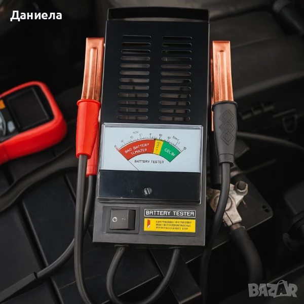 Подходящ за 6V и 12V оловно-киселинни батерии;Скала на измерване: 0–16V;Вграден товарен тест;Захранване: директно от тестваната батерия;Материал: метален корпус с пластмасови елементи;Мощни медни щипки с PVC изолация;Вграден бутон за включване/изключване.
