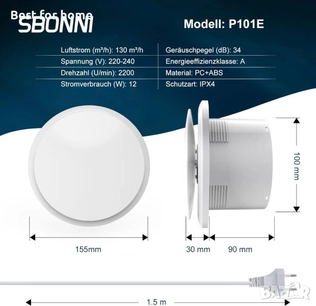 Вентилатор за баня, кухня, тоалетна, гараж SBONNI
