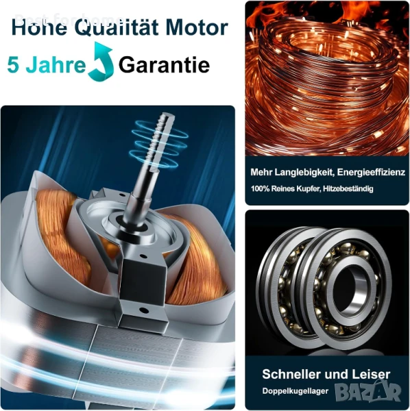 Специална функция IPX4, Тих и мощен, Мотор с двоен сачмен лагер, изработен от чиста мед, Защита от прегряване