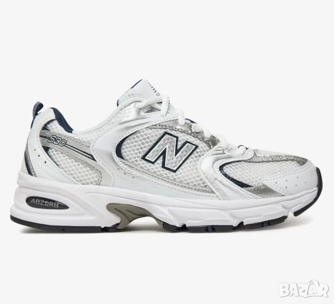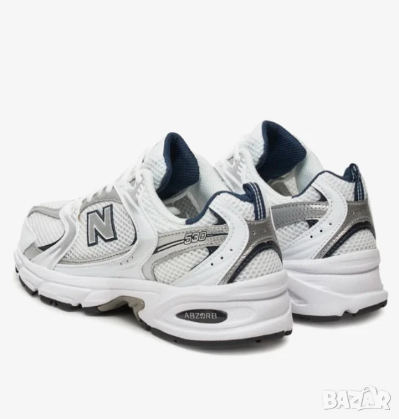 Маратонките 530 на New Balance се завръщат - този път в бяло с тъмносини и сребърни акценти. Моделът е с нисък силует, изработен от мрежести панели за дишане и е допълнен с лого „N“ отстрани. Отдолу, характерната междинна подметка ABZORB® осигурява по-добро омекотяване.