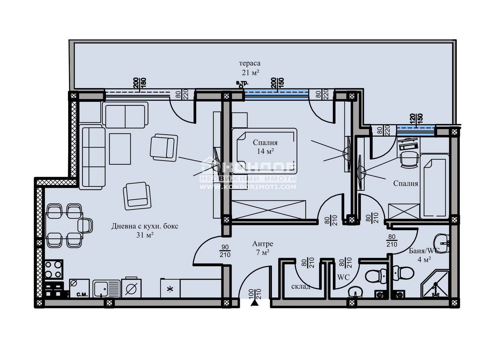 Предлагаме Ви възможността да си закупите тристаен апартамент в нискоетажна новоизсградена жилищна сграда намираща се на тихо и спокойно място в близост до всички необходими комуникации, училища, детски градини, удобен транспорт и големи хранителни хипермаркети. Сградата е проектирана с изключително нисък процент общи части - 10%, което дава повече реална и използваема площ на стаите и създава максимален комфорт на своите ползватели. Жилището се състои от дневна с кухненски бокс - 31кв.м., две самостоятелни спални, баня с тоалетна, втора тоалетна, склад, входно антре и една панорамна тераса от 21кв.м. с достъп от всички стаи. Перспективна ИНВЕСТИЦИЯ ЗА ОТДАВАНЕ ПОД НАЕМ!!! Изпълнението е осъществено с висококачествени материали и съвременни технологии, по европейски стандарт, шест камерна PVC дограма, блиндирана входна врата с 4-странно заключване, сензорно осветление, хидравлични асансьори с огледална кабина. Свободни паркоместа и партерни гаражи !!! Възможност за закупуване на разсрочено плащане в рамките на строителството или чрез Банков Кредит на изключително изгодни условия, договорени за клиенти на Агенция КОНДОР !!!ВИЖТЕ ОЩЕ ИЗГОДНИ ОФЕРТИ НА https://www.kondorimoti.com/ С ЕЖЕДНЕВНА АКТУАЛИЗАЦИЯ!