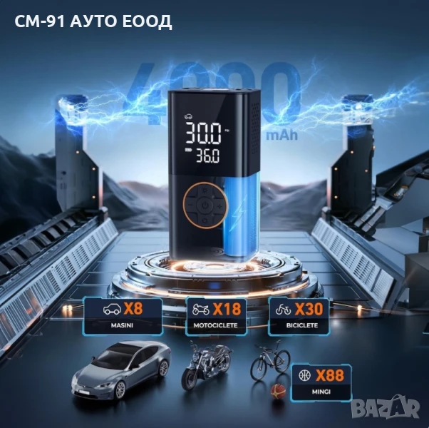 Дълъг живот на батерията и автоматично изключване: С напълно заредена вградена 4000mAh батерия, помпата за гуми може да напомпа до 8 гуми (195/65R15) от 30-36PSI. Предварително зададената функция и автоматичното изключване осигуряват безпроблемно надуване. С едно просто натискане безжичният компресор ще напомпа лесно автомобилни, мотоциклетни, велосипедни, топки и други гуми. (Забележка: Не е съвместим с тежкотоварни гуми като тези за превозни средства с висока проходимост, каравани, камиони и ремаркета.)