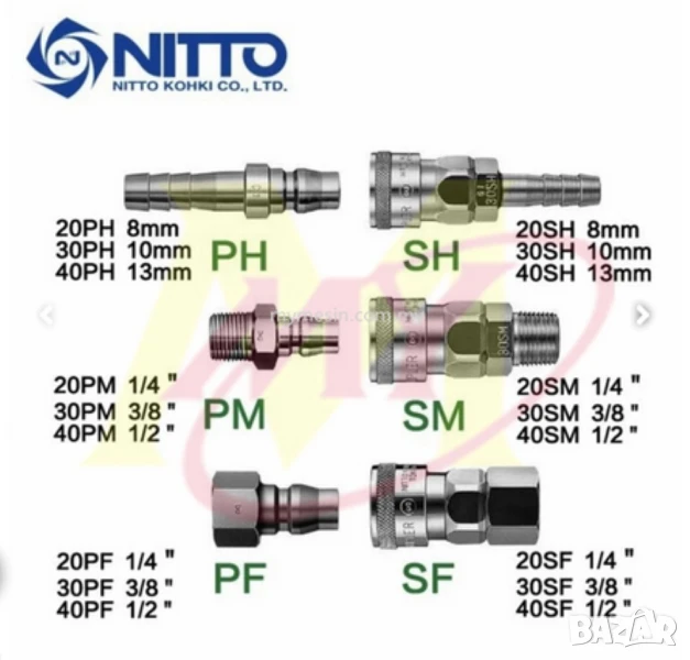 Високодебитни, неръждаеми, износоустойчиви накрайници съединители с голяма пропускливост за свързване на тръби и маркуч към бърза връзка въздушен клапан бързосменно съединение на пневматична инсталация на компресор за сгъстен въздух и др. С широко приложение за газове и течности - за изграждане на пневматични задвижвания и пренос на флуиди в промишлеността, работилница, гараж, автосервиз за гуми и ремонт на автомобили и др. за захранване на пневматични инструменти - гайковерти, тресчотки, чук секач длето къртач, пистолети за помпане на гуми, продухване, боядисване, флакони салам силикон лепило, прободен трион зеге, ножица за ламарина, шлифовалки, бормашина дрелка винтоверт отвертка и др.