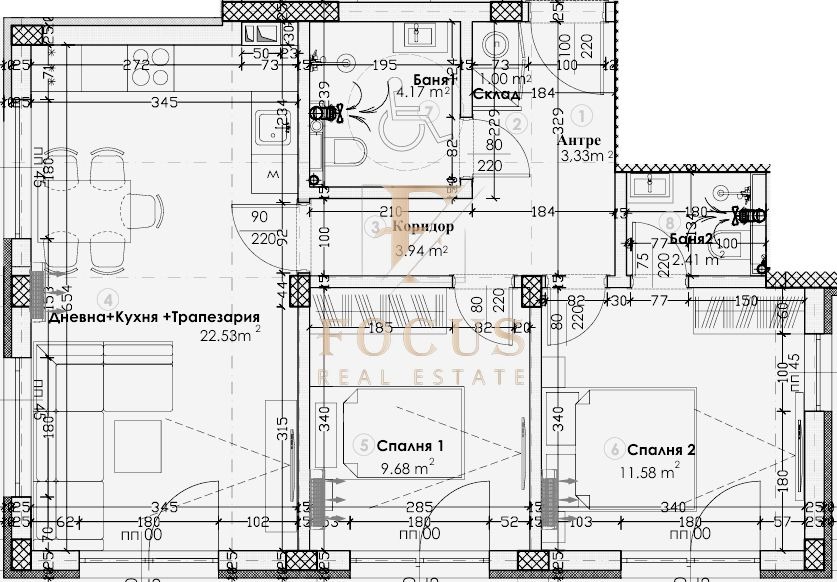 Разпределение: антре, просторна дневна с кухненски бокс, две спални, две бани с тоалетни и собствен двор - 80 кв.м.