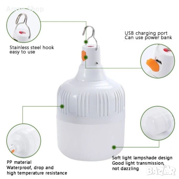 Преносима къмпинг лампа Акумулаторна LED лампа с USB Идеална за окачване в палатки приключения на открито , градински барбекюта , къмпинг пътувания и употреба при спешни случаи – Ултра ярка и лека! Тази универсална LED лампа е проектирана за различни нужди на открито и при спешни случаи., тя осигурява ярка светлина, което я прави идеална за къмпинг, барбекюта и градински дейности. Лекият и преносим дизайн я прави лесна за носене, а вградената кука за окачване позволява удобно поставяне в палатки или други пространства.Зарежда се чрез USB, което ви гарантира, че можете да я зареждате навсякъде, а здравата ѝ конструкция я прави идеална за приключения на открито или за аварийни ситуации. Независимо дали осветявате къмпинга си или се подготвяте за прекъсване на електрозахранването, тази супер ярка и енергийно ефективна лампа е за вас.