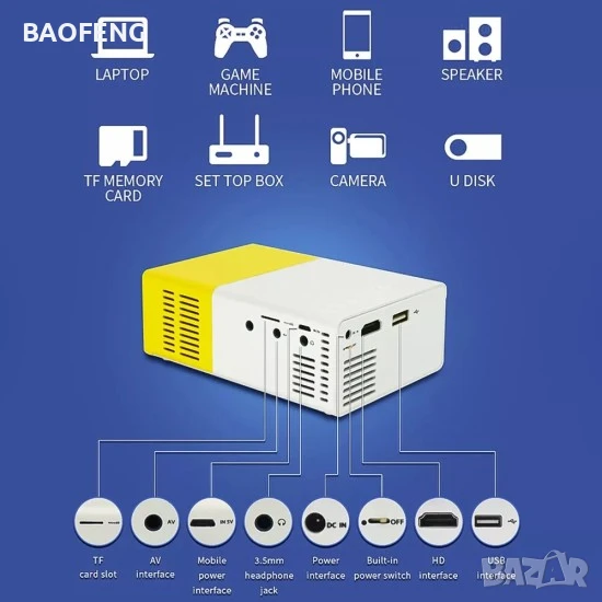 Проекторът разполага с разнообразие от портове, включително HDMI, USB, AV, Micro SD и изход за аудио 3.5 мм, така че може лесно да бъде свързан към различни устройства за показване на HD изображения и видеоклипове. Този мини LED проектор е идеален за забавление, развлечения и домашно кино.
