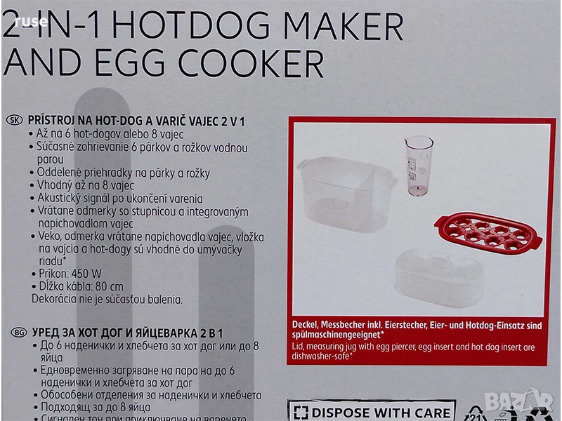 - Капакът, мерителната чаша, вкл. иглата за яйца и приставката за хот дог са подходящи за измиване в съдомиялна машина