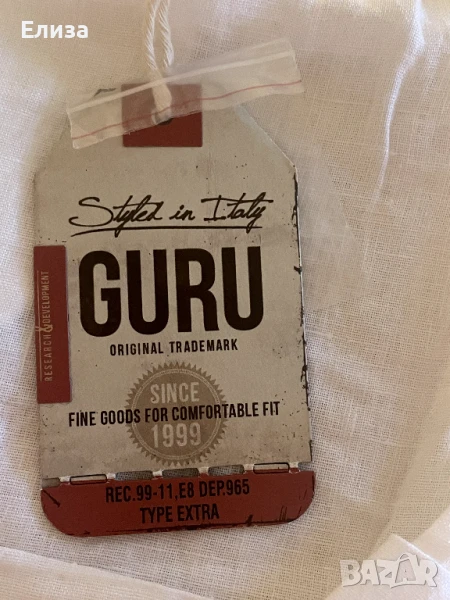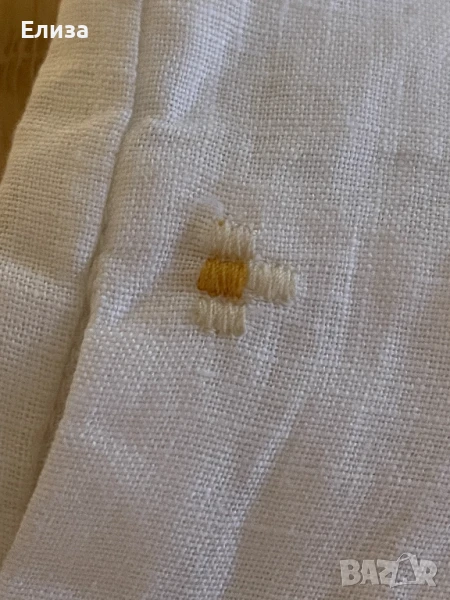 Състав: 100% лен. Цвят: бял. С ниска талия. Обиколка на талия: 76 см. Ханш: 106 см. Дължина в предна част: 33 см. Дължина на задна част: 37 см. Широчина на крачола в долната част: 32 см.