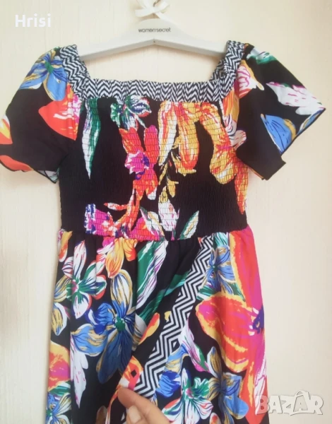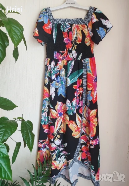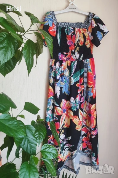 Нова, ефектна лятна рокля. Черен модел с ярки флорални акценти. L размер. Покрита овална цепка открива леко единия крак. Много лека материя.