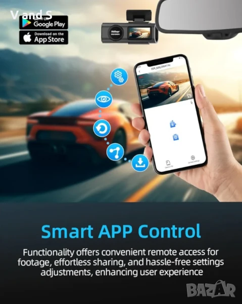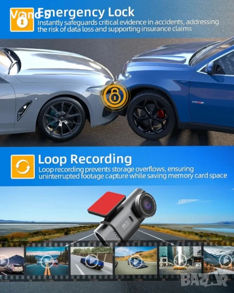 Камера за автомобил с WiFi и управление чрез приложение] - Изтеглете приложението "Viidure" (БЕЗПЛАТНО) на вашия IOS или Android смартфон и се свържете с WiFi мрежата на 4K камерата за автомобил. Можете лесно да настроите камерата за автомобил, да гледате видео в реално време и да управлявате видеоклипове на вашия смартфон. Когато се случи нещо интересно по време на пътуването ви, можете да го споделите в социални медии като YouTube, Instagram, Twitter, Facebook и др. с едно щракване в приложението. Вече няма да се притеснявате, че ще повредите SD картата си, като често я изваждате.