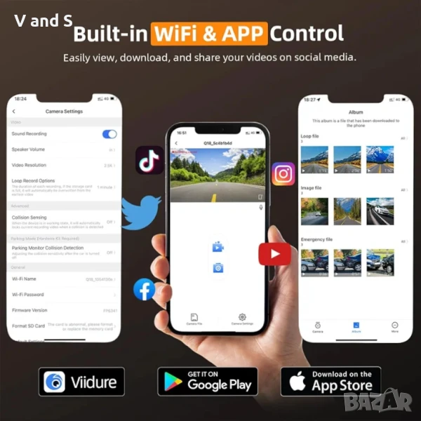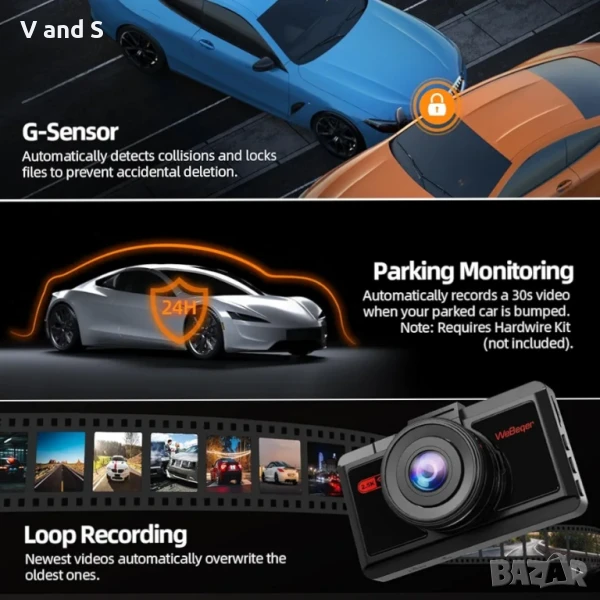Специална функция: Цикличен запис, вграден WiFi, G-сензор, нощно виждане, управление чрез приложение