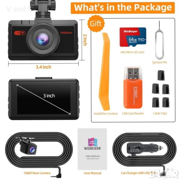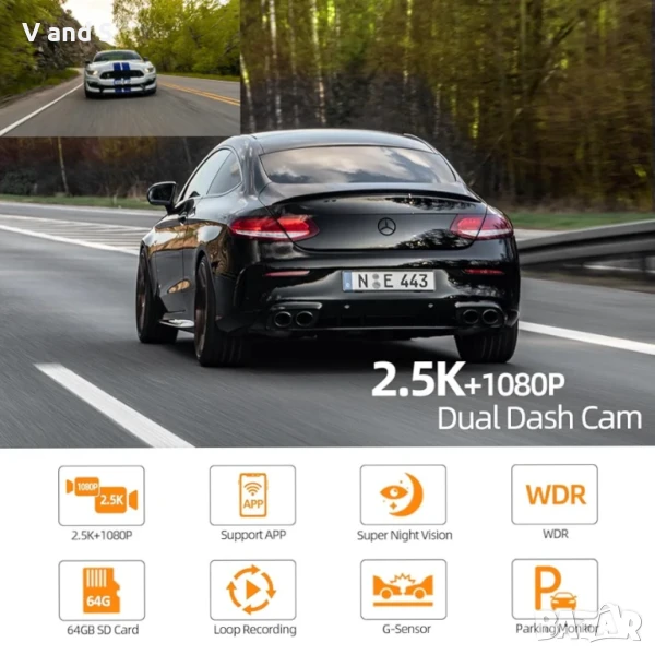 Видеорегистратор за автомобили отпред и отзад, 2.5K/1080P камера, безплатна карта 64GB, вграден WiFi