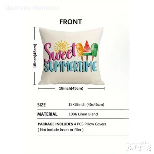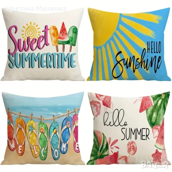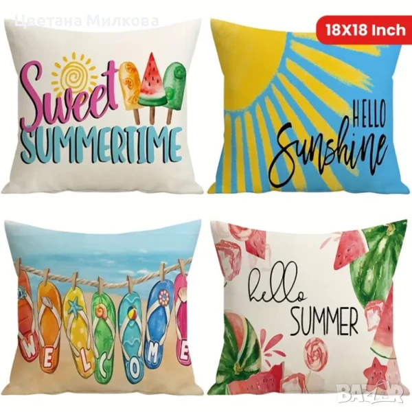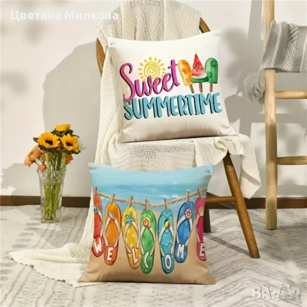 Летни, весели тънки калъфки за възглавници с двустранен принт и дискретни ципове. Подходящи за декорация на всеки вътрешен и външен интерьор.