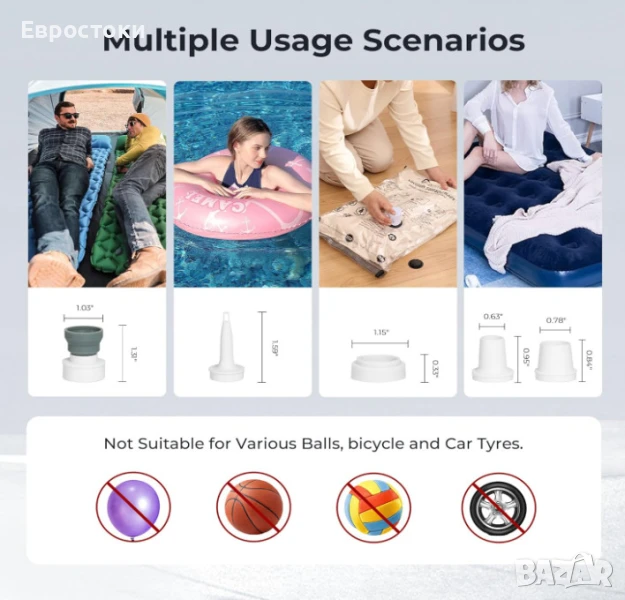 5 различни дюзи. Разполага с 5 различни размера въздушни дюзи за големи надуваеми предмети, надуваеми предмети за басейни, надуваеми матраци, надуваеми легла и лодки. Позволява ви да пълненете/изпускате различни предмети за всеки повод!
