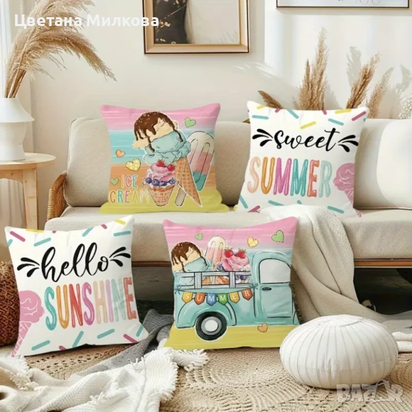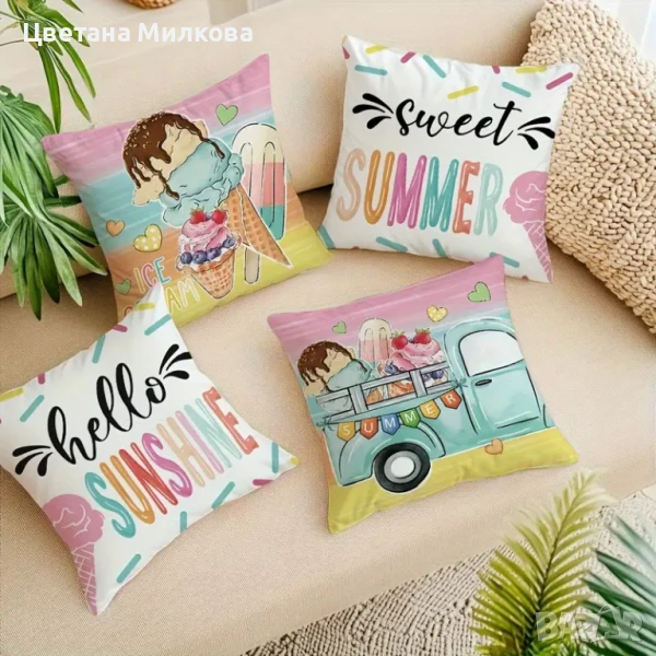 Комплект от 4 части летни калъфки за възглавници с едностранно принтиран сладък летен стил, квадратни, полиестерни, модерни, с дискретни ципове.