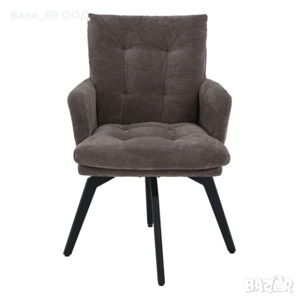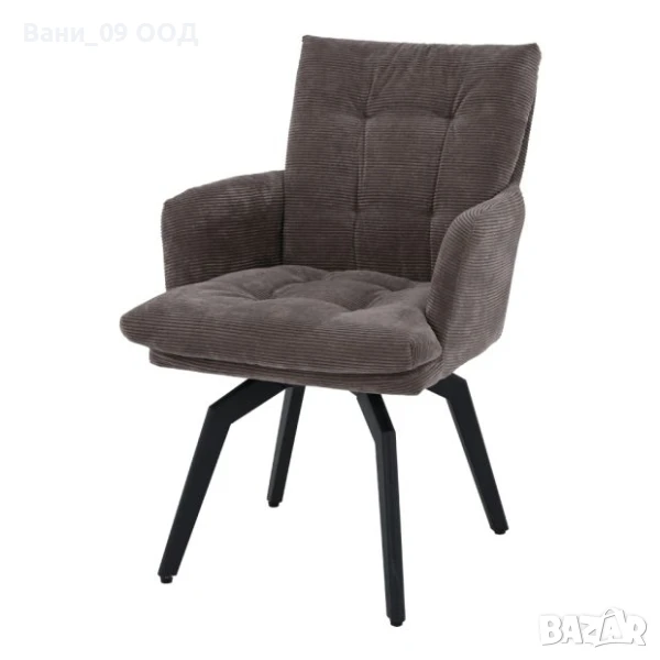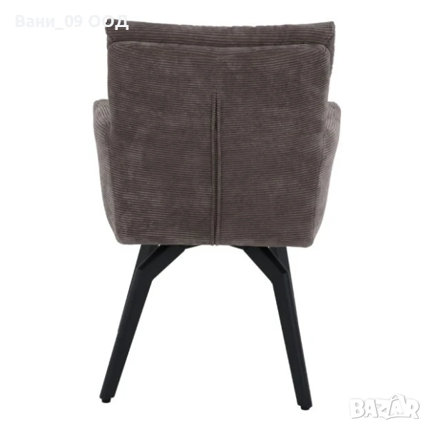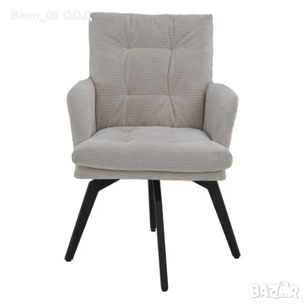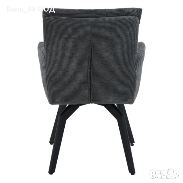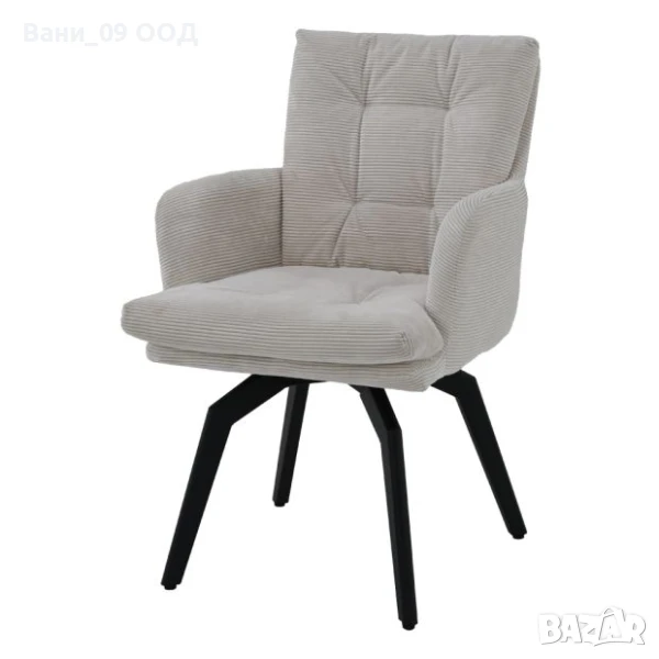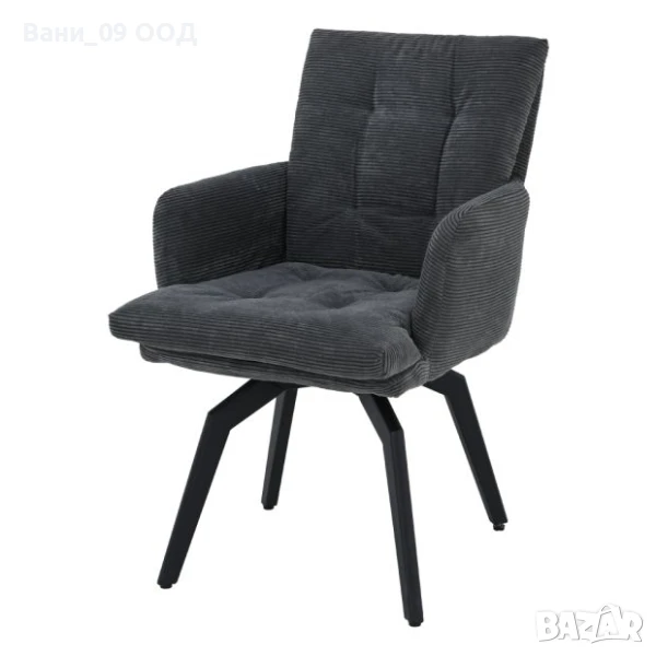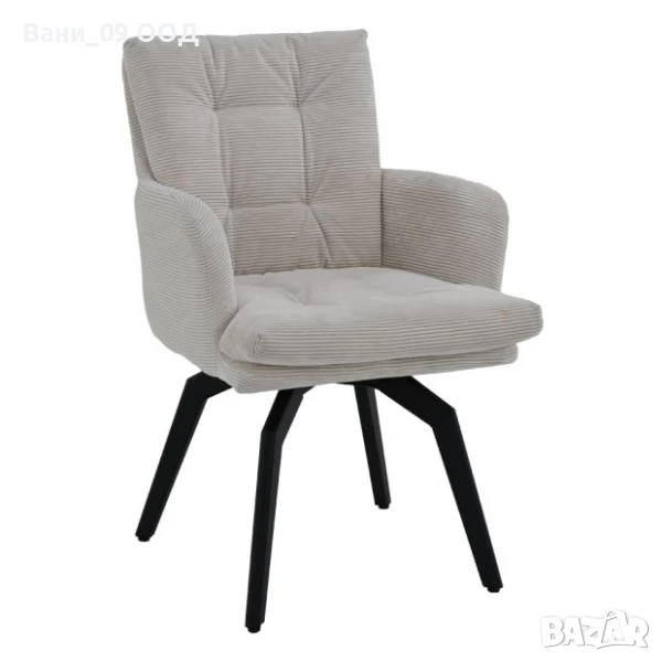 Повърхността, от която е изработен, е кадифе, което се хармонира деликатно при допир. Тъмните метални крачета са прахово боядисани, осигуряващи товароносимост на въртящия се стол 120 кг. Сърцевината е съставена от полиуретанова пяна, което ще ви предостави комфортна и обширна седалка, притежаваща функция въртене в радиус от 180 градуса.