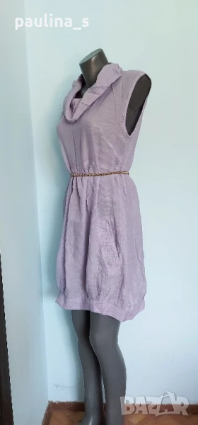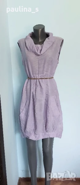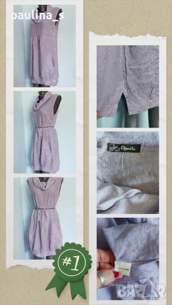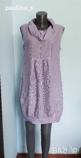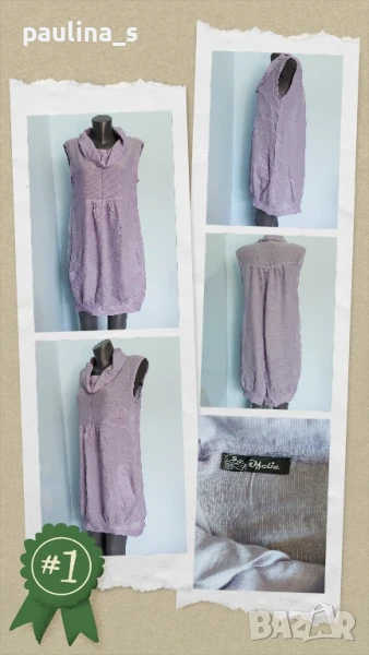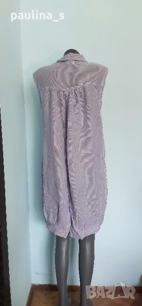 2️⃣. L / XL - "Ofelia". Цената е крайна 24,99лв. Дамска лилава туника от изключително фин индииски памук на дискретни вертикални бели райенца. Материята е много ефирна и с прозрачност. Моделът е много готин, обемът е за сметка на набори започващи от раменната платка отпред и отзад. Джобовете са косо разположени отпред с филетки. Долу завършва с маншет и 4 двойни басти отпред и отзад симетрично. Отзад има много симпатична малка цепка с 3 бр седефени копчета, яката е богата и може да прегъва или набира по желание на притежателката.