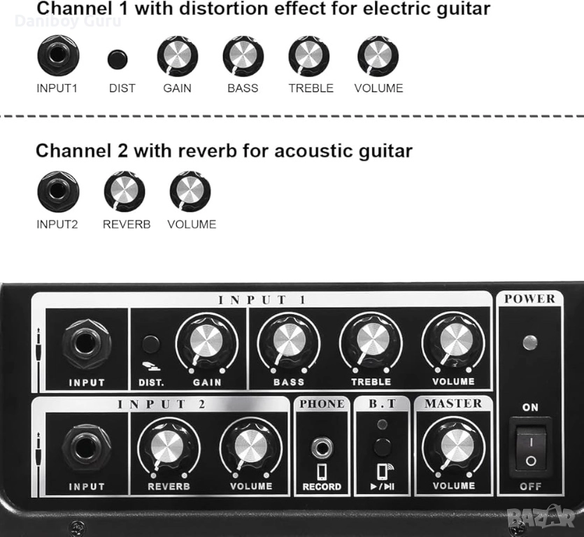 Два канала: канал за електрическа китара с ефект на дисторшън, канал за акустична китара с реверберация, ще ви осигурят отлична звукова устойчивост.
