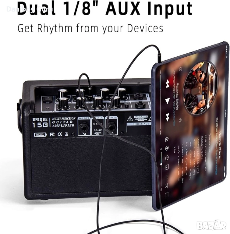 15 вата: 15-ватов китарен усилвател, който осигурява експлозивен тон със супер преносим размер.