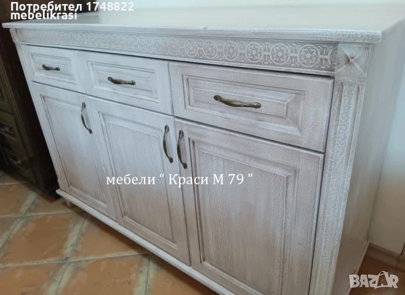 Профилът с дърворезба и старинните дръжки придават на шкафа завършен и стилен вид.