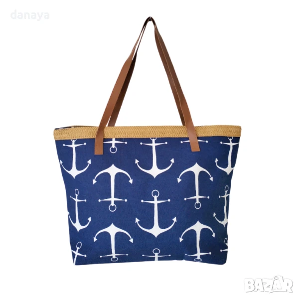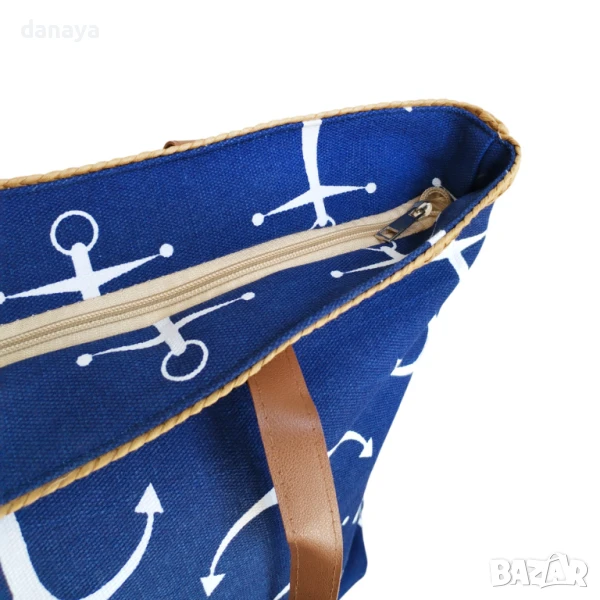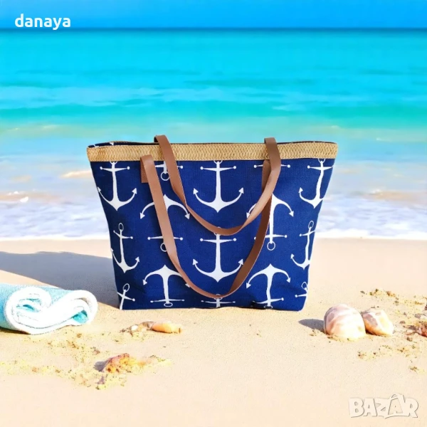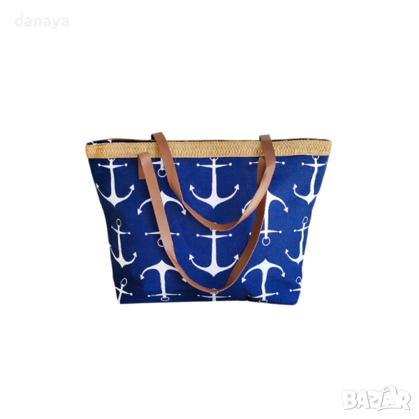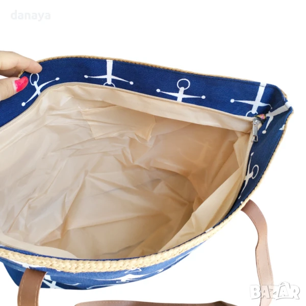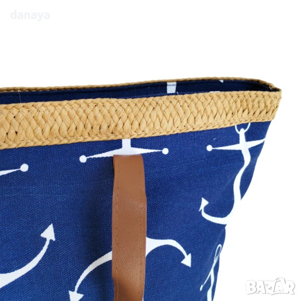 Голяма тъмно синя плажна чанта с кожени дръжки и плетен кант от естествени материали. Чантата може да побере всичко необходимо за плаж. Здрави кожени дръжки. Изработена от здрав плат, затваря се с цип. Във вътрешната си страна има малко джобче за поставяне на телефон или други малки аксесоари.