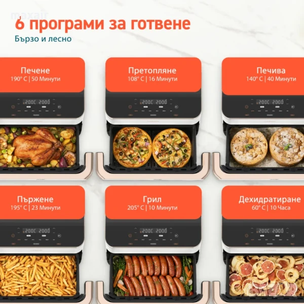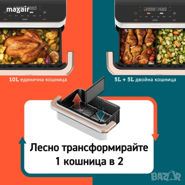 - Синхронизирано готвене: Използвайте едни и същи настройки за двете кошници, за да удвоите бързо количеството приготвена храна.
