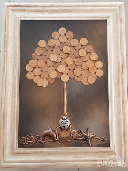 Актуална, авторска картина - Дървото на живота с истински монети със златна риба и юбилейна бутилка декорирана с кожа във формата на торбичка, златни цифри 50 г. и дървета плочка с пожелание.
