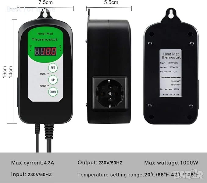 Диапазонът на температурен контрол е 20–42°C, номиналното напрежение е 220 V/50 Hz, а максималното натоварване е 4,2 A, 1000 W. Не потапяйте контролера или сондата във вода.