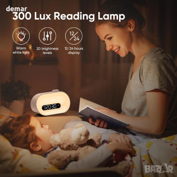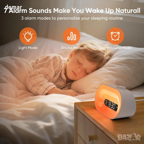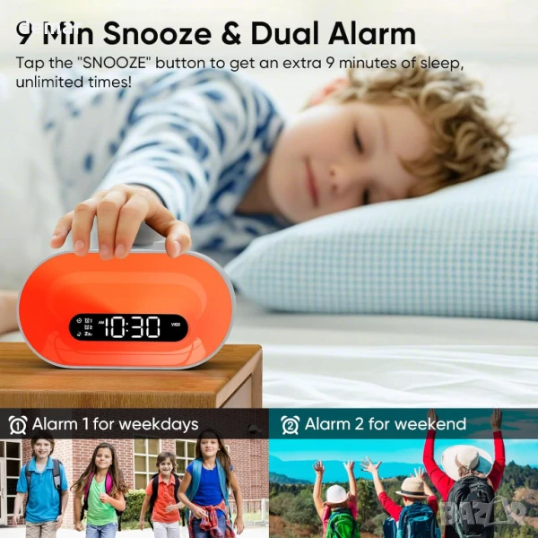 Този будилник с изгрев постепенно осветява стаята ви в продължение на 10–60 минути за по-нежно събуждане, подкрепен от широка гама от 30 релаксиращи звука, като бял шум, приспивни песни и звуци от природата, които ви помагат да спите по-добре. Той разполага с двойни аларми за различни графици, голям бутон за дрямка за допълнителна почивка и нощна светлина с регулируеми бели, цветни или променящи се цветове режими, идеална както за възрастни, така и за деца. Можете да регулирате яркостта от 0 до 100% и силата на звука на 16 нива за комфорт и защита. Включва таймер за автоматично изключване, функция за памет и се захранва чрез USB с резервна батерия, за да запази настройките за времето и алармата по време на прекъсвания на захранването.
