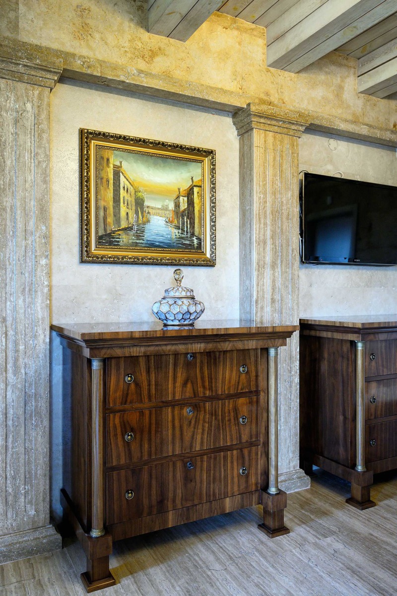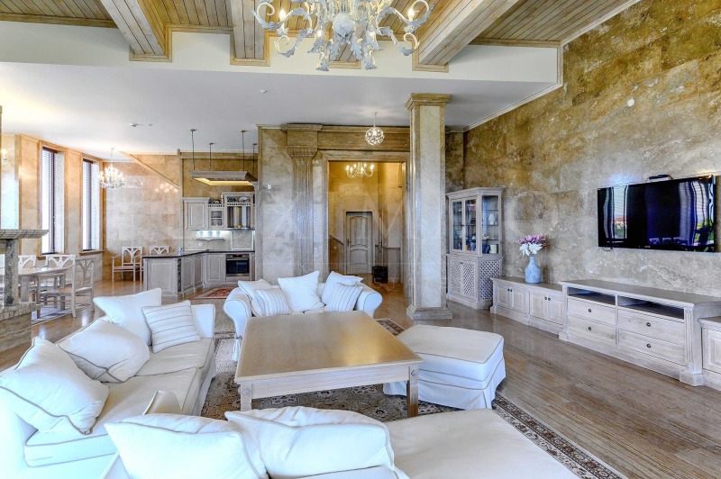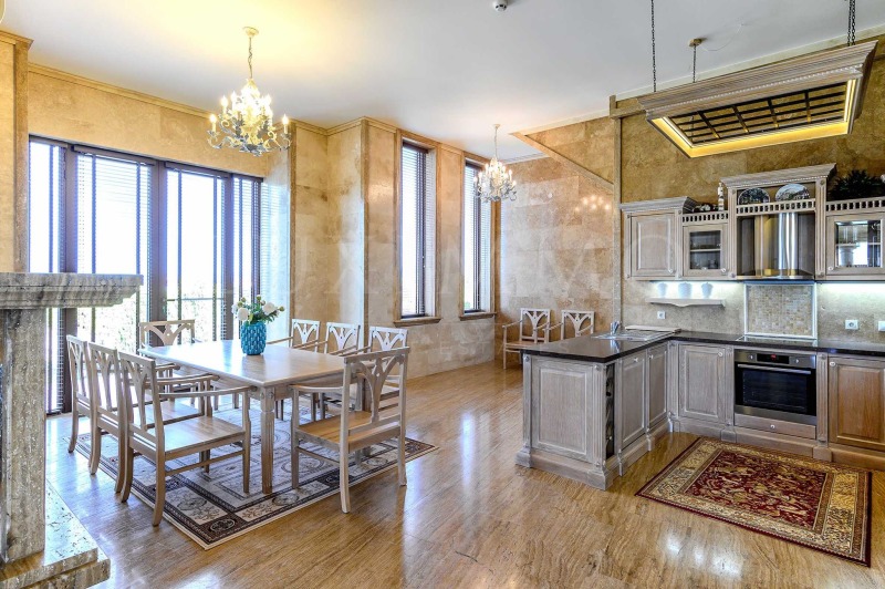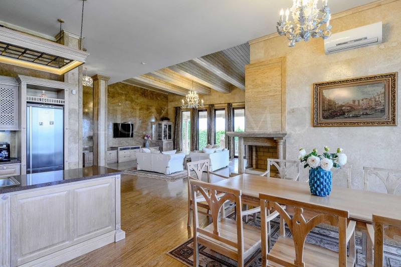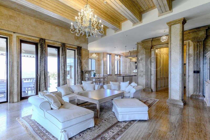 Елегантен пясъчен цвят и неговите нюанси, изискано бяло и масивно дърво, класическата красота на мрамора, привличаща погледа със затаен дъх универсална комбинация за вътрешен дизайн на този ефектен дом, като един естествен модел на интериора с шик и уникалност, подбран за съвременния човек със статус и отличен вкус.