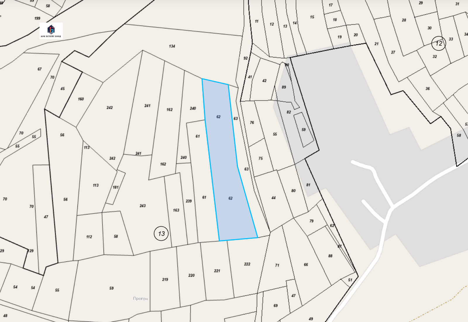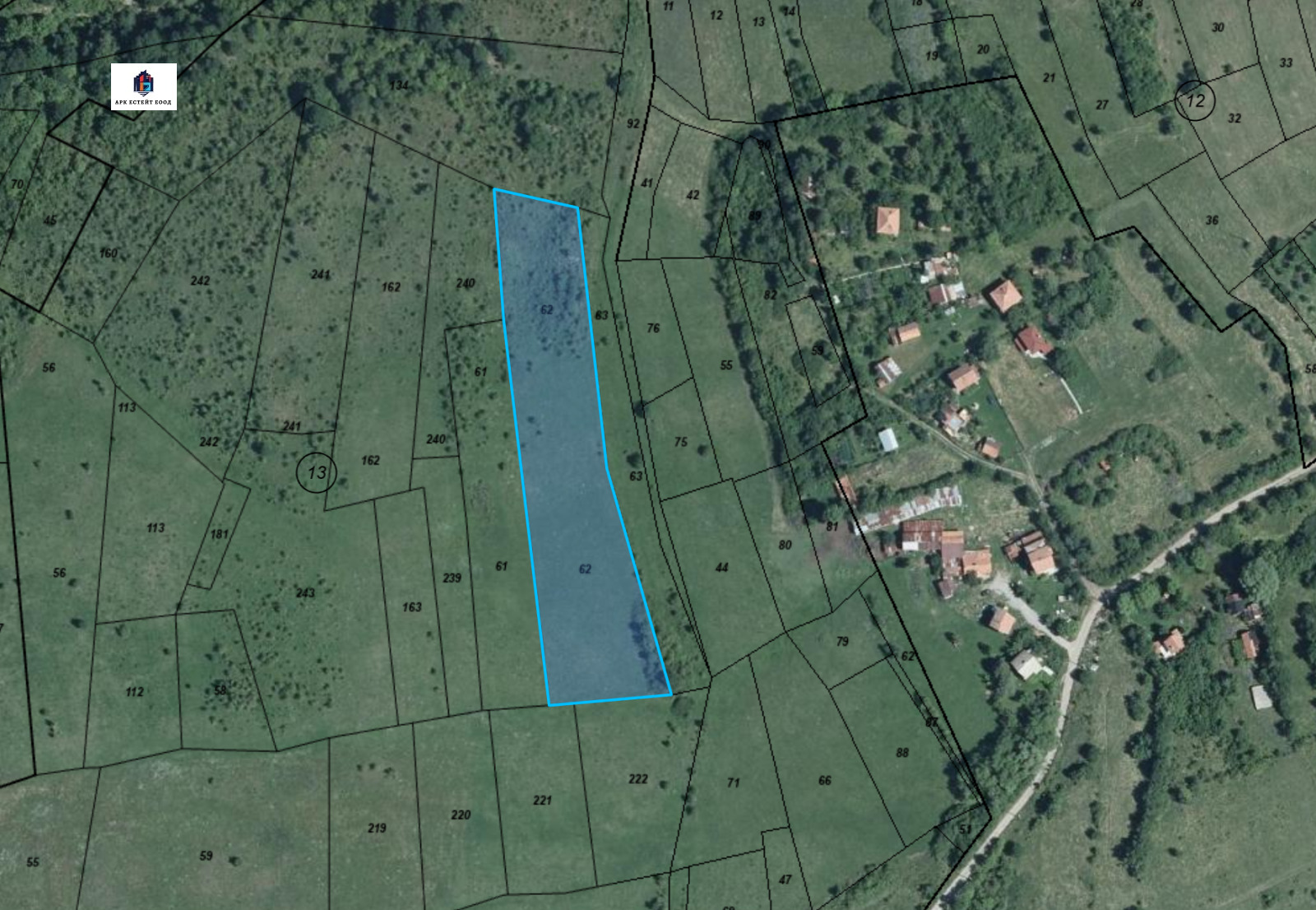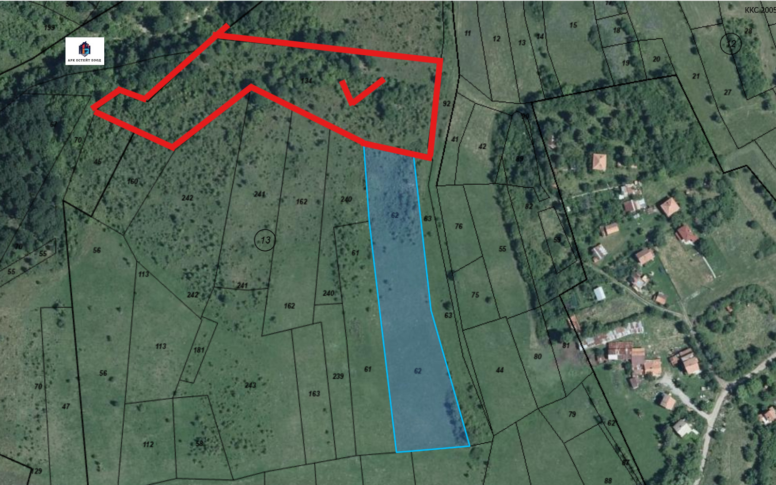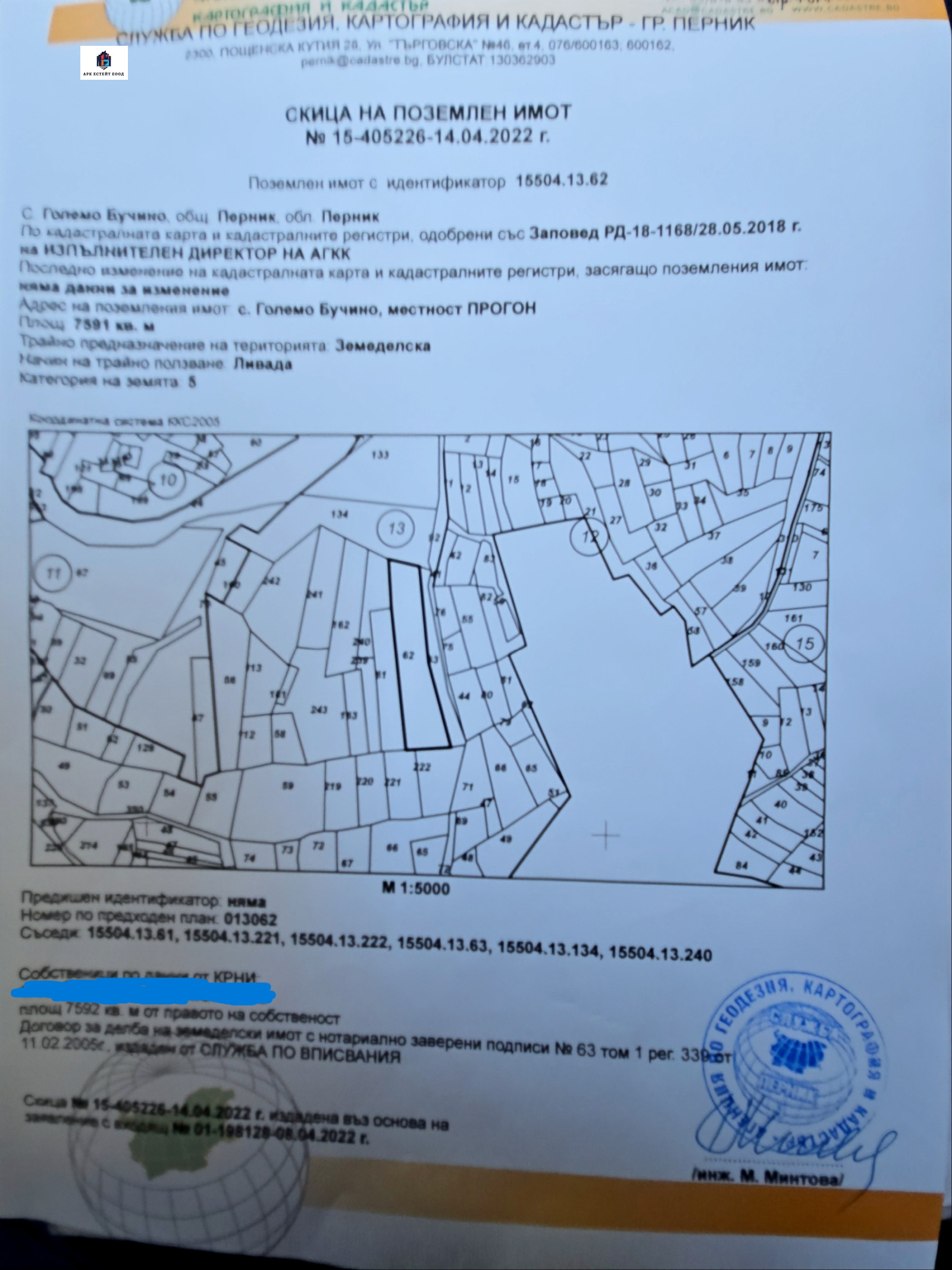 'АРК ЕСТЕЙТ' ЕООД Ви предлага слънчев ПИ със статут на земеделска земя в местността 'ПРОГОН', кв. Бачова Махала, с. Големо Бучино. Имота е с идентификатор 15504.13.62 и с площ 7591 м2. Намира се на 5 минути от центъра на селото. Маркиран е на картата. Парцелът е със земеделско трайно предназначение и 5-та категория. Агенцията предлага и граничещ до него ПИ с идентификатор 15504.13.134 и площ от 9998 м2, отбелязан на снимките. Също така предлагаме и други имоти в с. Големо Бучино.