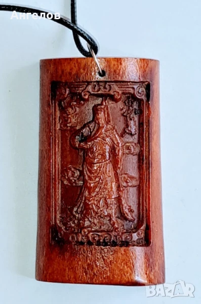 Много стар, но отлично запазен амулет, ръчно резбован от биволска кост. Изобразява богинята на милосърдието Гуан Ин, една от най-почитаните фигури в будизма, особено в китайската, японската, корейската и виетнамската традиция. Името ѝ означава „Тя, която чува плача на света“. Смята се за покровителка на добродетели като душевен мир, състрадание и благословия и носи закрила на притежателя си.