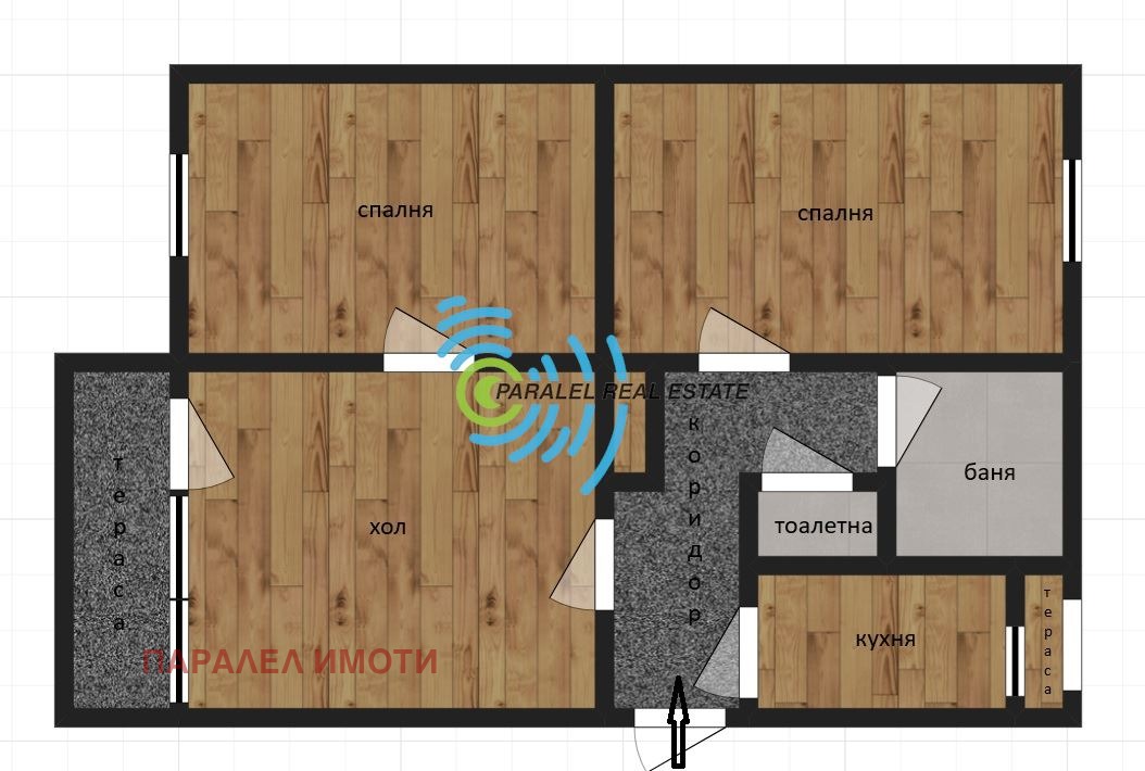 20071512 ЕКСКЛУЗИВНО ! КЛЮЧ. РАБОТИМ С КОЛЕГИ ! Апартамент последен етаж 5 от 5 .Изложение ЮГ - СЕВЕР. Големи паркови пространства и алеи около жилищната сграда. Тиха и спокойна улица. Функционално разпределение на жилищното пространство: