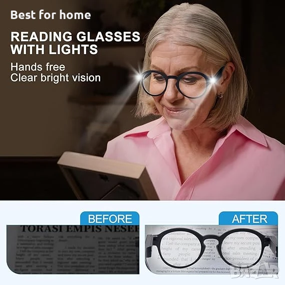 Класически дизайн и усъвършенствана технология! Могат да се използват като обикновени очила за четене, а когато включите LED диода, могат да се превърнат в светлина. Идеални за осветление със свободни ръце! Двоен режим на работа с батерия, дълготрайна мощност, мощните LED светлини от всяка страна на рамката могат да ви осигурят ясно и ярко виждане в тъмното. Идеални за употреба в колата, в леглото, в самолета, на къмпинг или на място, твърде тъмно за четене, без да безпокоите другите около вас.