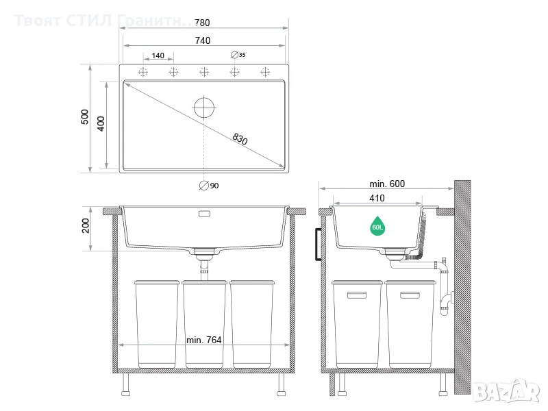Продуктовите снимки показват предложената инсталация със сифони Твоят Стил. Преливникът и цедката, които се виждат на графиката, не са елементи от мивката и се продават