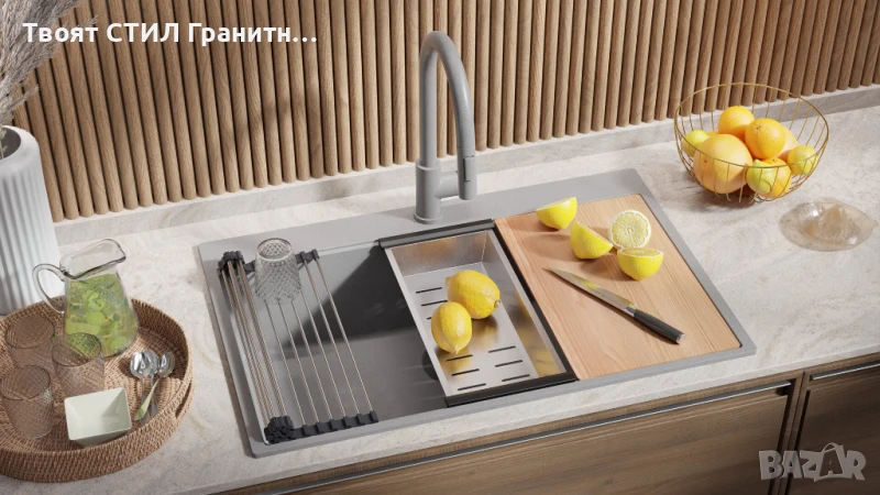 Тази конфигурация превръща вашата мивка в многофункционално работно място, подобрявайки както удобството, така и организацията на кухнята.