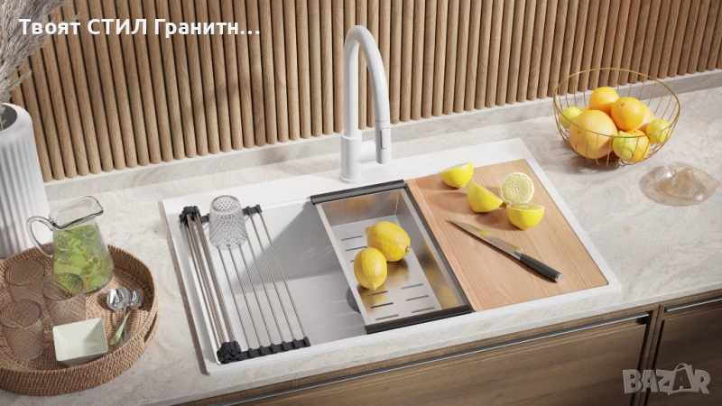 Тази конфигурация превръща вашата мивка в многофункционално работно място, подобрявайки както удобството, така и организацията на кухнята.
