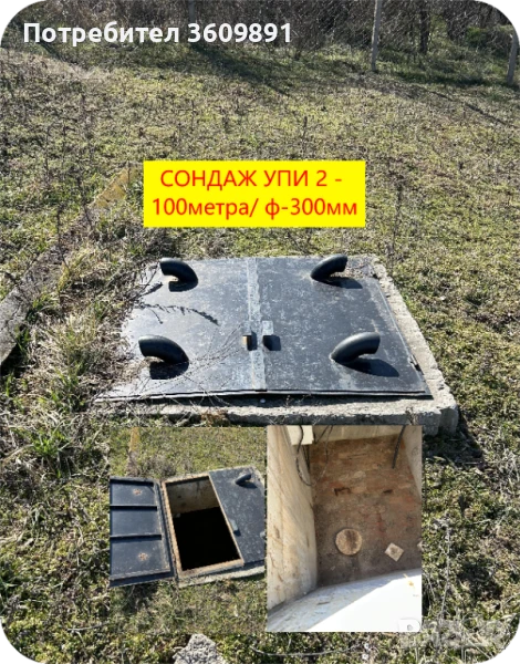 УПИ 2 ( ВиК-партида и ТОК-партида-подземен -ТРИФАЗЕН) Също така и на този имот има сондаж за вода 100м. дълбок с изградена подземна стая за басейни и помпени саоръжения, налична сондажна помпа + табло +300л. разширителен съд, положени са тръбите за вода на басейн. И на този имот има изградена и ВиК шахта 1,5м (дълбока ) 1,2м (широка) от бетонни пърстени с метлна вратичка.