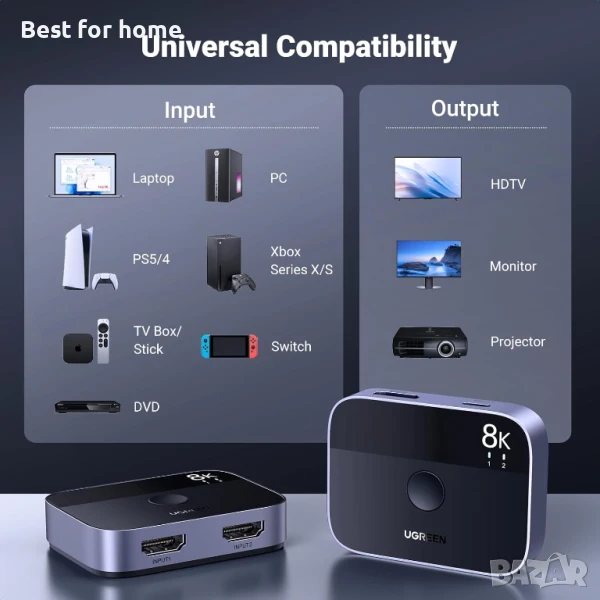 Двупосочен HDMI превключвател 2 входа 1 изход: Омръзна ли ви постоянно да превключвате между множество игрални устройства на телевизора си? UGREEN HDMI превключвателят 4k 120Hz го прави изключително лесно! Свържете 2 от любимите си устройства, като PS5, Xbox, Switch, Roku и лаптоп, към един телевизор или споделете един монитор, той може да свърже 2 източника на сигнал към 1 дисплей. Или свържете 1 HDMI източник на сигнал, за да превключвате между 2 дисплея. (Два дисплея НЕ МОГАТ да показват едновременно)