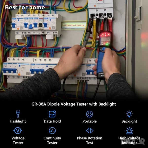 Мултиметърът GR-38A е универсален тестер за напрежение, идеален както за домашни, така и за промишлени приложения. С обхват на измерване 12-690V AC/DC и функции като тестване на непрекъснатост на веригата и фазова последователност, предупреждение за прекъсвач с високо напрежение и други, това е основен инструмент за електрически проекти.