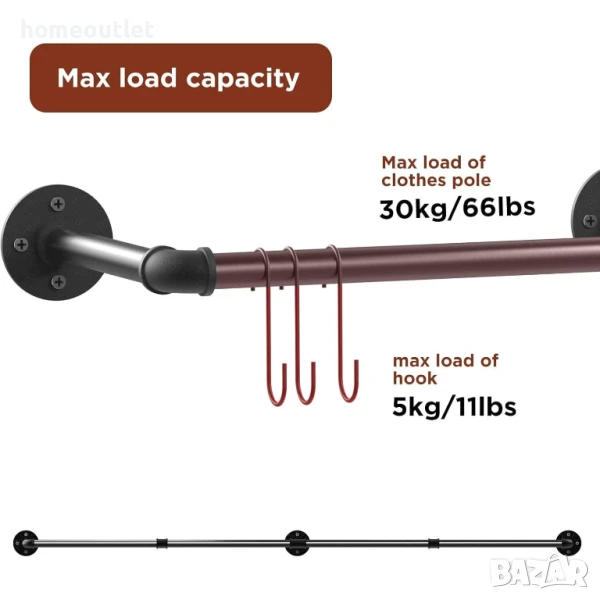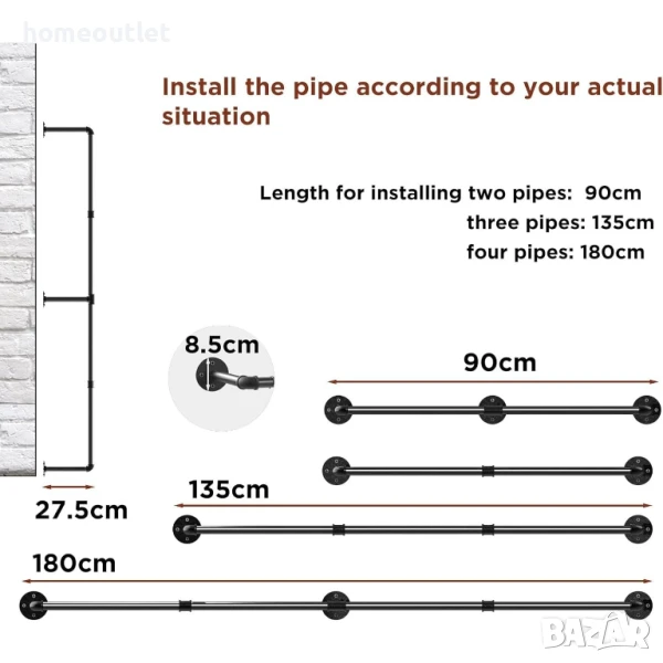 Тази релса за дрехи се състои от 4 стоманени тръби с резба, 1 къса стоманена тръба, 3 фланеца, 2 90-градусови колянови съединителя, 2 комбинатора и винтове за стенен монтаж.